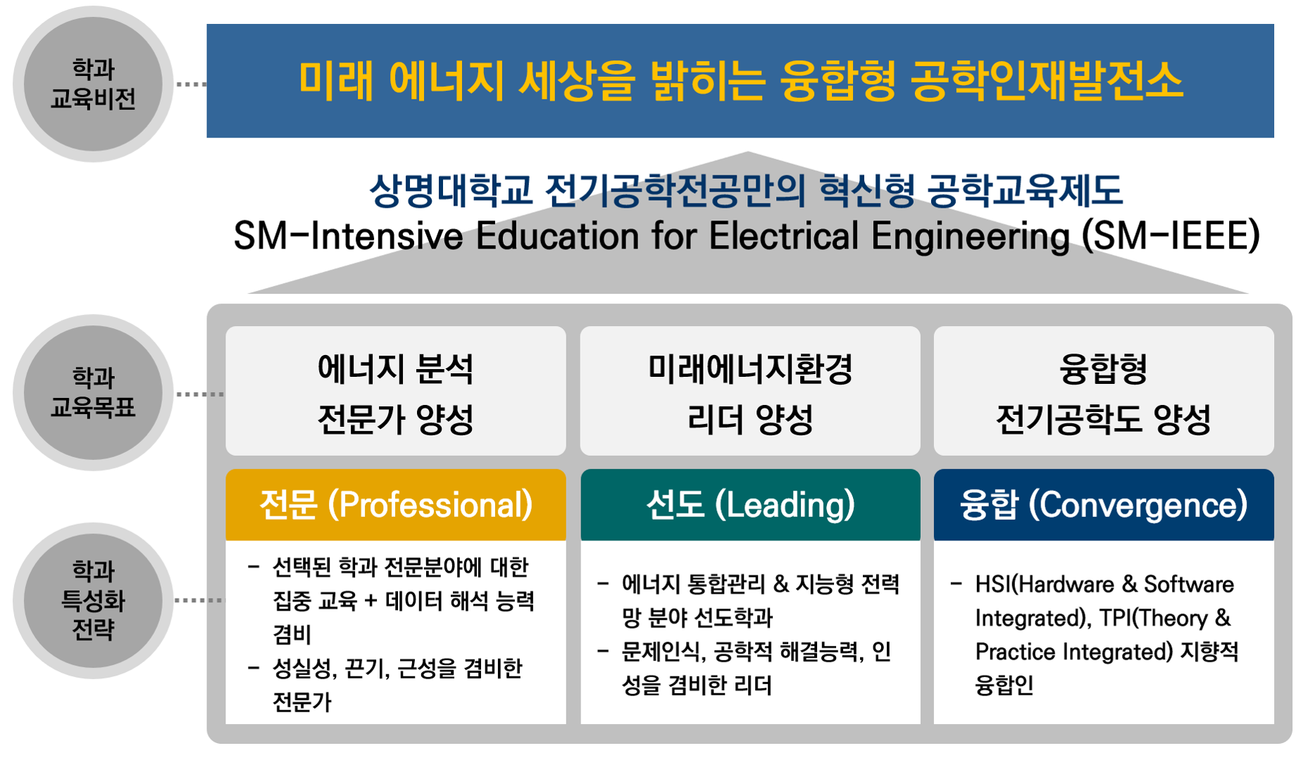 전기공학전공는 이론과 실무를 겸비한 하드웨어 (H/W) & 소프트웨어(S/W) 통합형 엔지니어를 양성하고 전력송배전 신기술, 스마트전력설비, 신재생에너지, 에너지관리솔루션 등 전공 분야의 특성화된 교육 능력을 갖춘 인재 양성을 교육목표를 둔다.